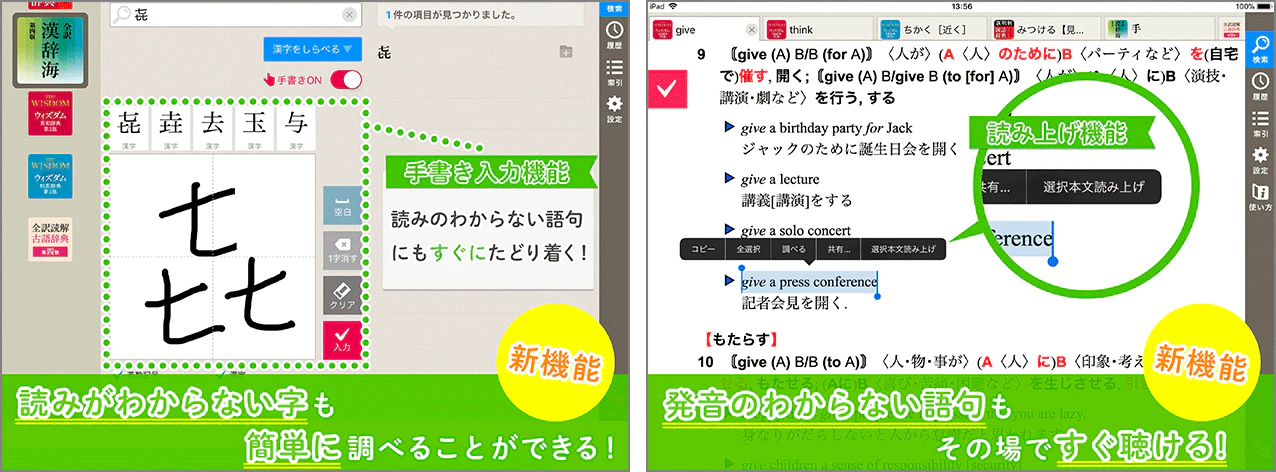 手書き文字による検索が可能に。読みが分からない漢字も簡単に調べられるようになりました。