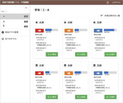 ログイン/ログアウト日時や各級の達成率(問題数に対する正答数)等を確認することによって、生徒の状況に合わせた指導が可能になります。