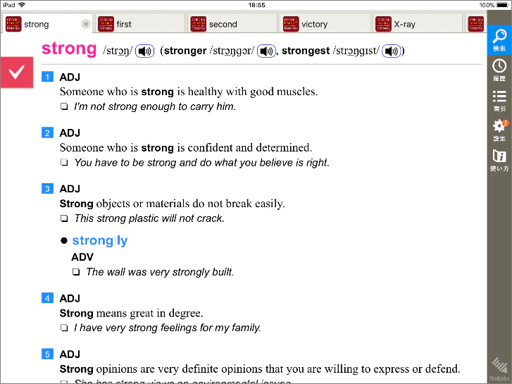 一覧で辞書を選択すると、その辞書で調べた結果を表示します。