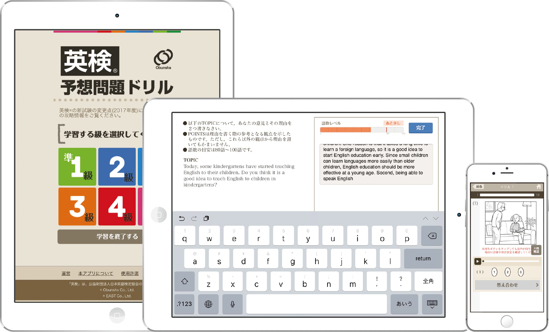 旺文社刊「英検®予想問題ドリル」をベースにした英検®対策用アプリ。最新の問題形式に対応し、リスニング問題はもちろんライティング問題も収録。中学校以上を想定した「5級~2級セット」、高校以上を想定した「3級~準1級セット」は、生徒によって目標とする級が異なる学校での利用に最適です。