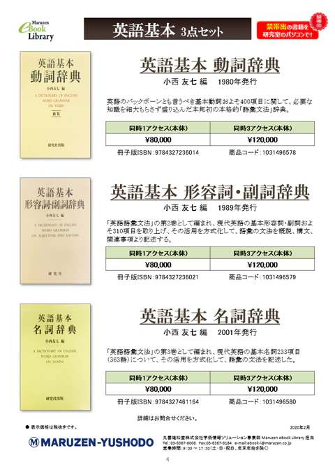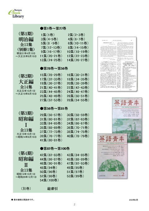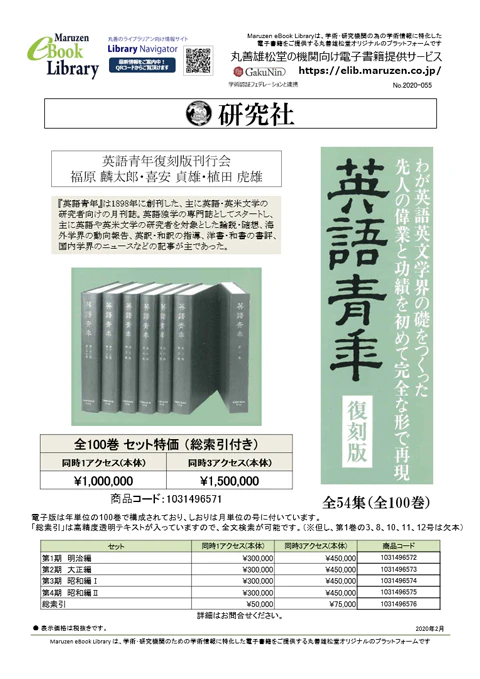 イースト株式会社(東京都渋谷区、代表取締役 熊野哲也)は、昨年10月に開始した「電子復刻」プロジェクトで研究社「英語青年(復刻版)」100巻、「小西友七:英語基本(動詞/形容詞・副詞/名詞)辞典」3巻、大空社出版「明治新聞雑誌文庫所蔵雑誌目録総覧」150巻の販売をMaruzen eBook Libraryで開始しました。
