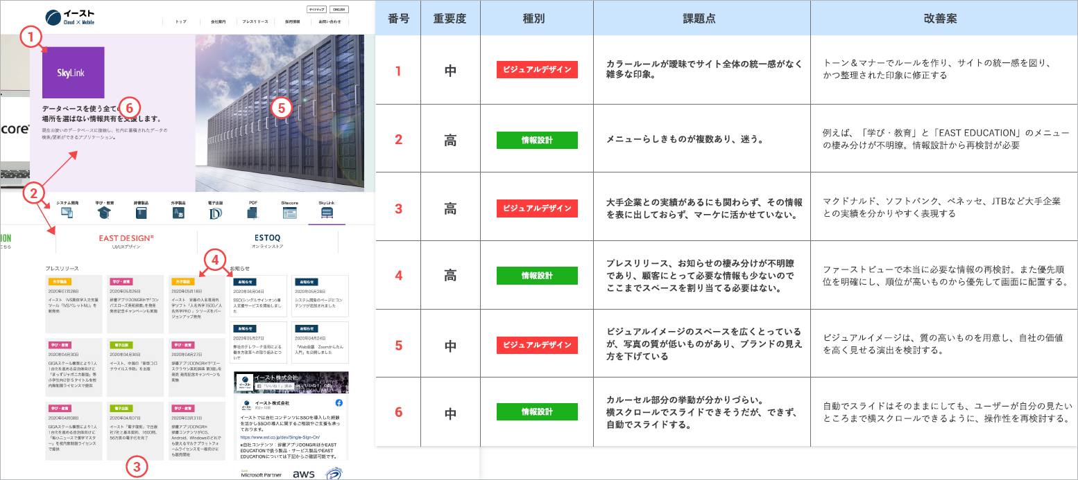 弊社デザインチームで、UI/UXフィードバックを用いて、課題の洗い出し、改善案の検討を行った資料の一部です。このほか、SitecoreのSXAを活用した更新のしやすさや、デジタルマーケティング機能の活用も考慮したリニューアルとしました。