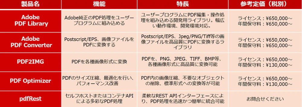 「Adobe PDF Library」は、Adobe Acrobatと同一のコアテクノロジー による開発者用ライブラリです。PDFによる電子帳票、電子署名、フォーム、プリプレスなど、ペーパーレス化を推進するためのクライアントおよびサーバーソリューションに、Adobe PDF 機能を簡単に埋め込めます。