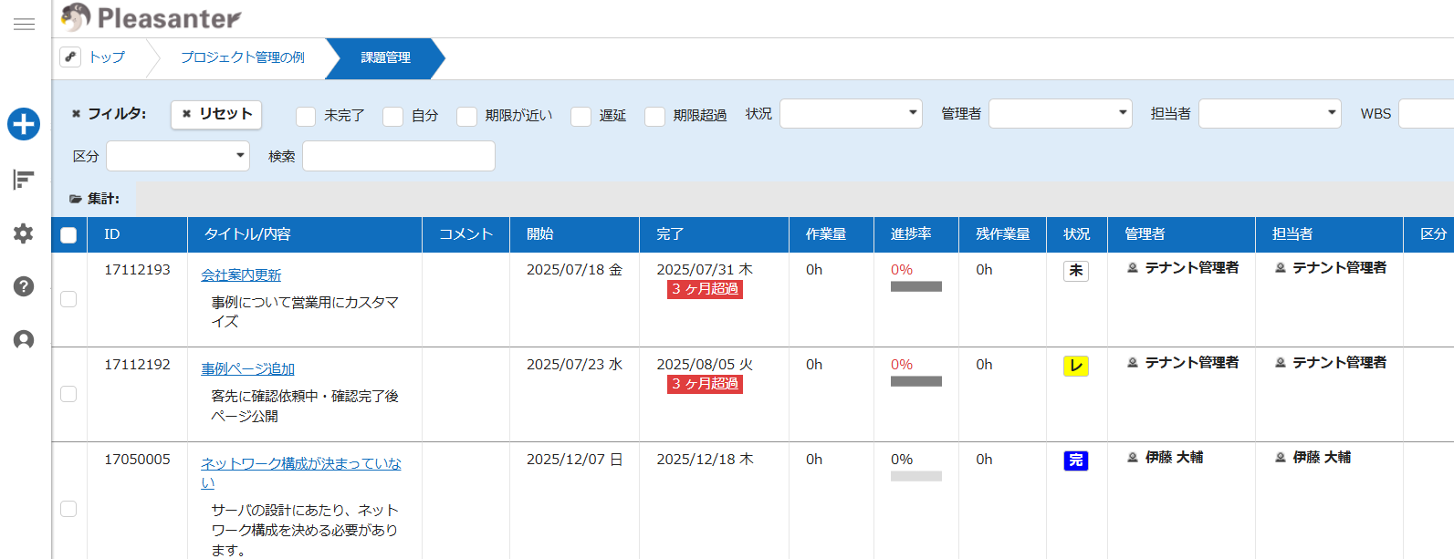 作業名、開始日、終了日の登録だけでなく作業進捗も未着手、作業中、レビュー中、保留などから状況に合わせて選択可能です。