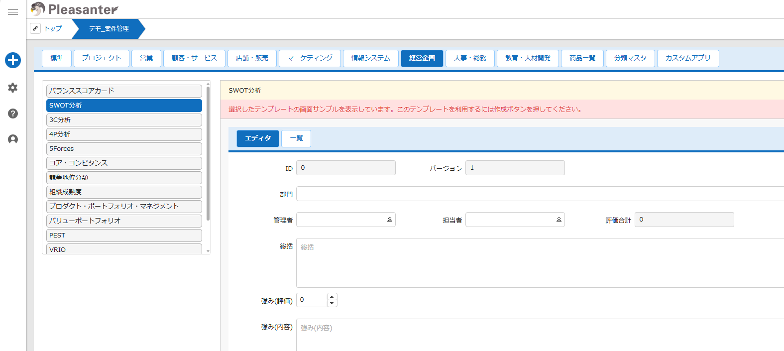 SWOT分析、3C分析、4P分析といったビジネスフレームワークで利用可能なものも用意されています。